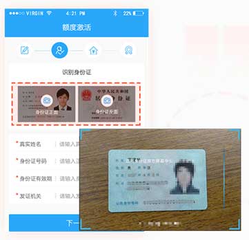 移动端整合了OCR识别的SDK,可以直接调用手机端摄像头对各类证件进行识别,自动采集卡片资料,配合校验措施,保证存入信息真实,避免人为造假,例如:身份证、银行卡、驾驶证等。
