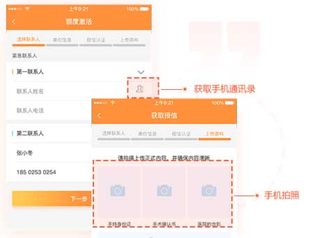 移动端特有:OCR证件识别、用户活体识别、GPS定位、授权获取通讯录、照片、授权一键登录、拍照上传、语音采集等借款申请资料快速获取功能。